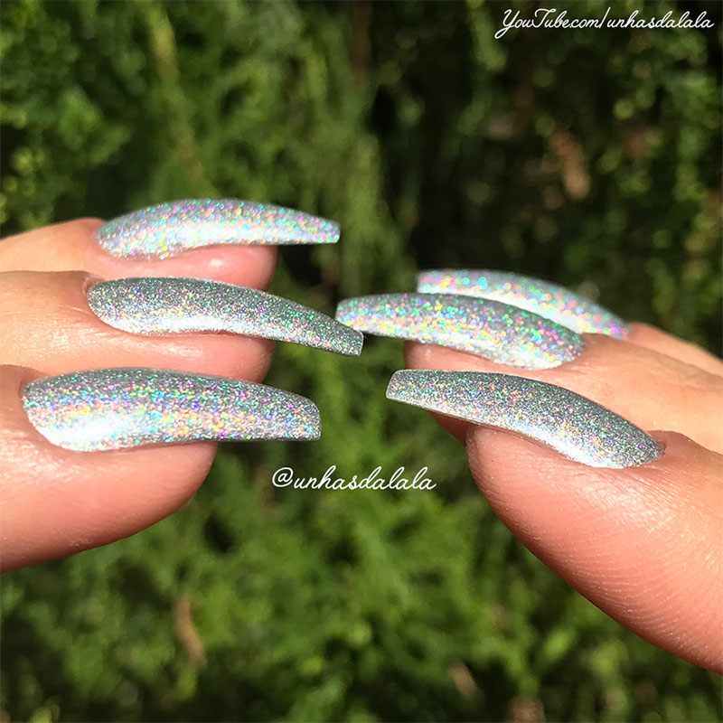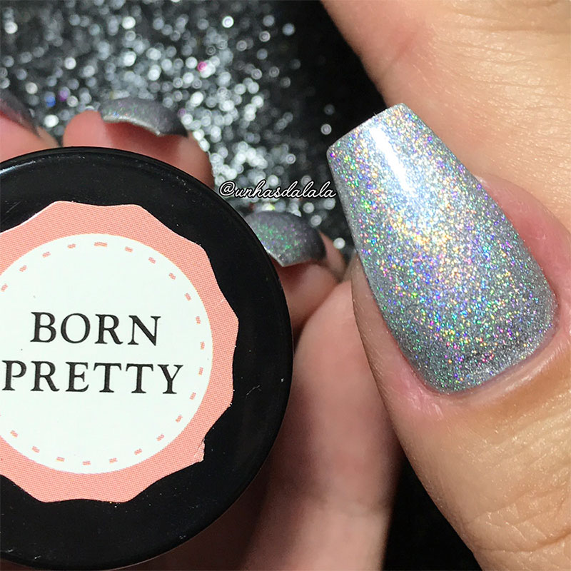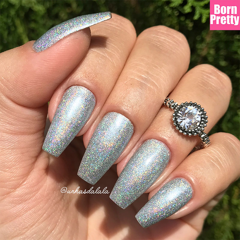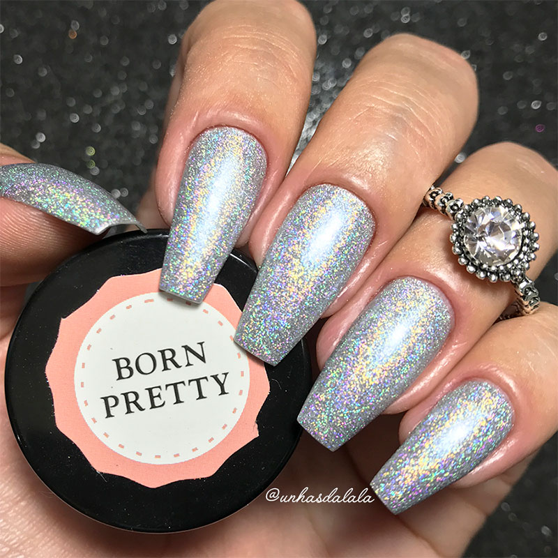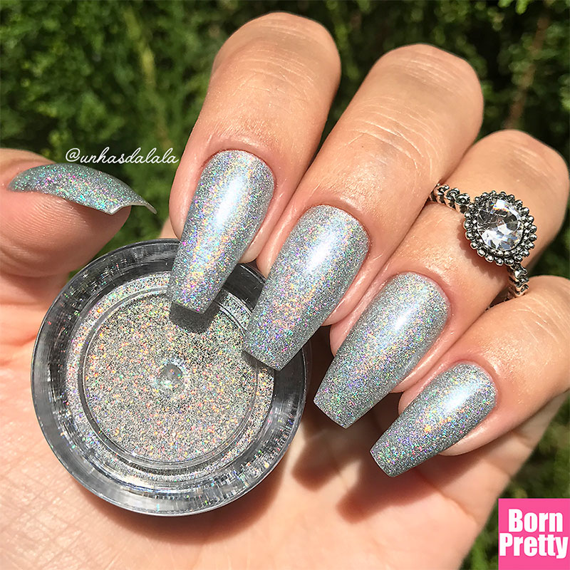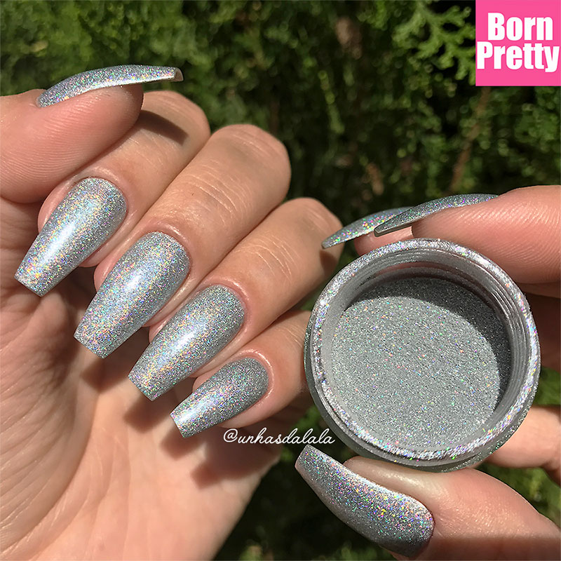 Se tem uma coisa que eu adoro nas unhas é um bom glitter holográfico. Usei um em pó da loja Born Pretty Store holográfico prata e ficou um espetáculo de lindo.