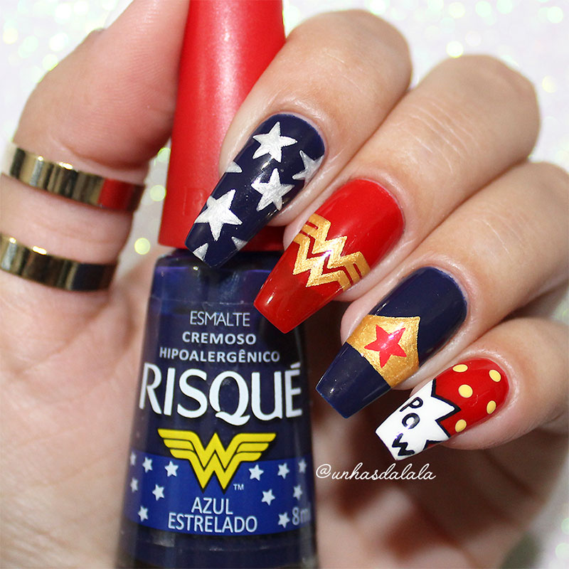 A nail art contém desenhos que remetem muito a personagem e o mundo dos quadrinhos. Fiz as estrelas da roupa dela, o símbolo WW (Wonder Woman), a tiara e dois balões cômicos com expressões de luta.